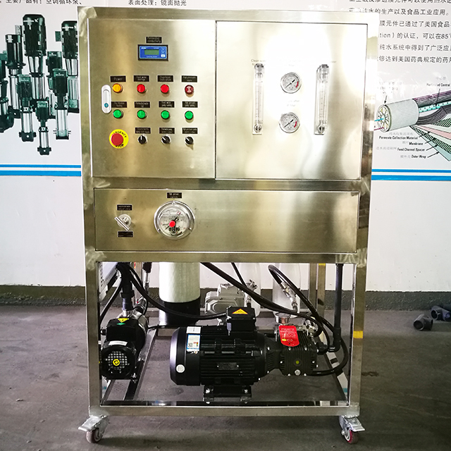 反滲透海水淡化設備是指海水通過多級過濾器,經泵增壓,利用反滲透膜(RO膜)分離技術一次性將高含鹽量的海水,轉變為低鹽量的淡水,達到人們從海水得到淡水飲用的目的;也可按需處理成純水、純凈水、超純水等。